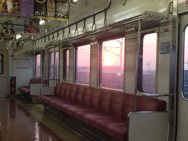 御殿場の先の富士岡駅から岩波駅の間は富士山がきれいに眺められる区間として有名です。夕暮れに映える富士山を見ることができました 。