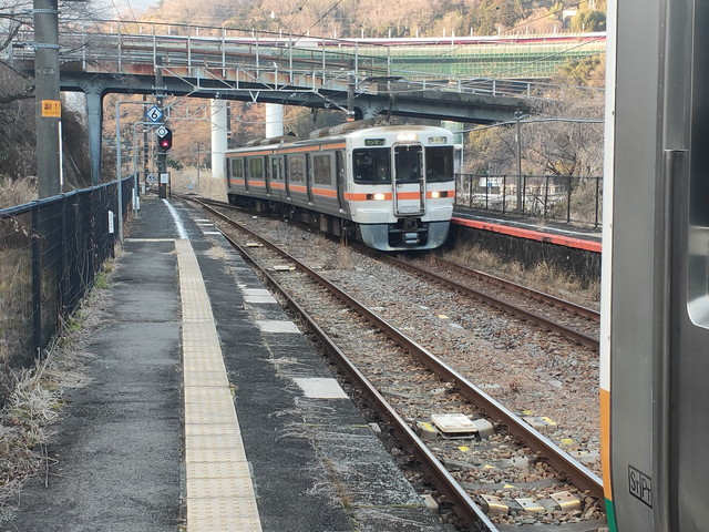 11時1分発の普通列車富士行きに乗車します。今度は2両編成のワンマン列車で、小さな駅にも律儀に停車していきます。途中の駅で列車行き違いのために5分以上停まるところが何箇所かあり、 富士駅まで約3時間もかかります。