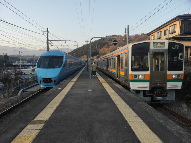 また途中の駅では御殿場発の松田から小田急線に入る小田急ロマンスカーの特急ふじさん号と行き違いをしました。沼津には17:42に到着です。