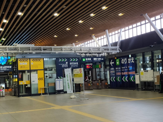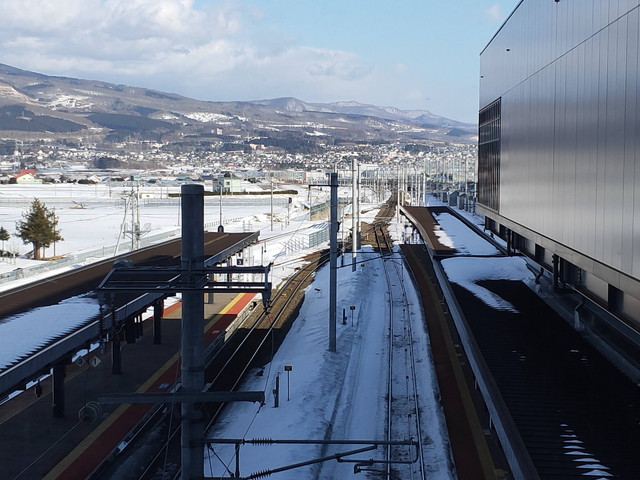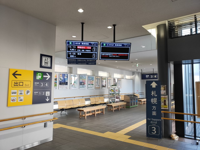 新函館北斗駅に到着すると、到着ホームは1階ですが、改札はなぜか2階に上がります。改札を抜けると函館方面はすぐ隣が乗り換えホームになっていますが、札幌方面は階段を上って反対側のホームへ降りて行きます。