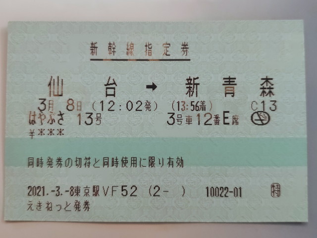 あおば通駅にある指定券券売機で発券をしてみましたが、指定券発行回数は1回分で仙台から新青森と新青森から新函館北斗の分が発券できました。