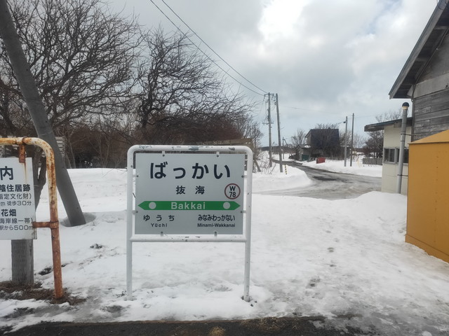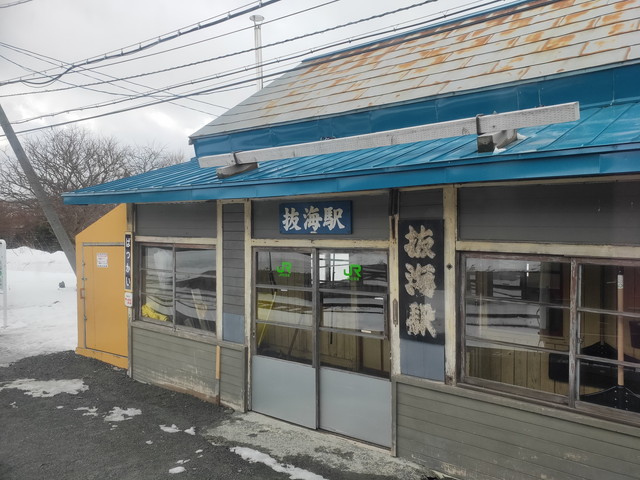 海岸線がだいぶ近くなってきて抜海駅に到着します。 この駅の駅舎は立派でホーロー引きの駅名標も存在感があります。