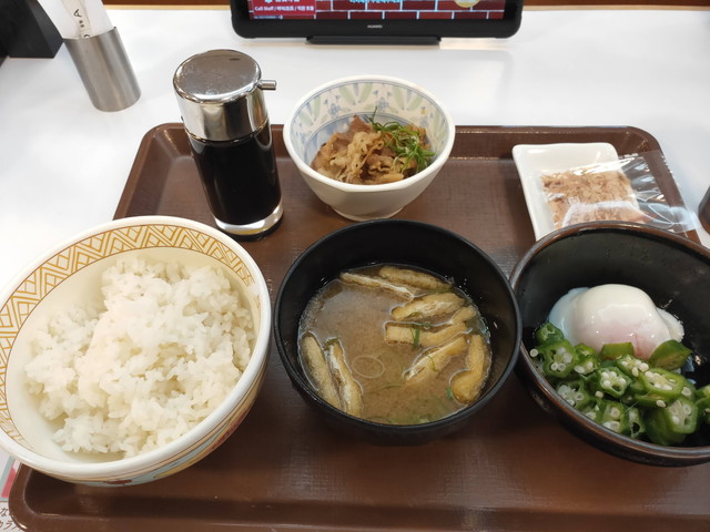 駅名に売店もコンビニも見当たらない!急いですき家へ向かい朝食メニューを食べる