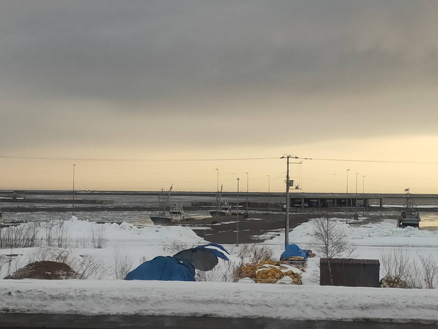流氷目当てな人たちは左側座席で海が近づいてくるのを今か今かと待っていましたが、港が見えてきても水面が穏やかに広がるばかりです。