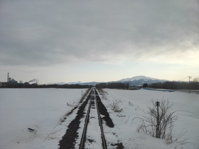 車窓左手には斜里岳が迫ってくる感じです。線路だけが水平線に向かって伸びる景色が広がります。