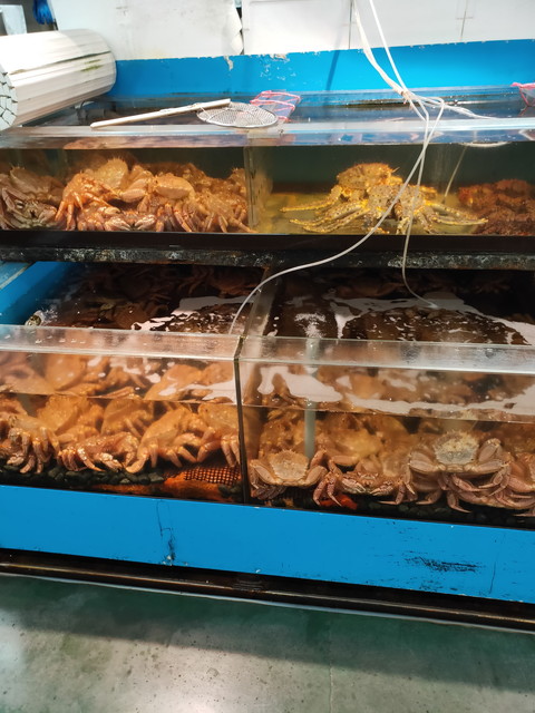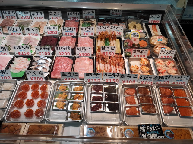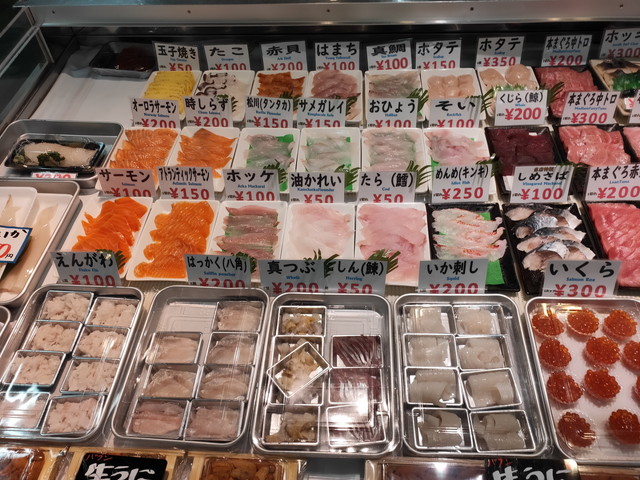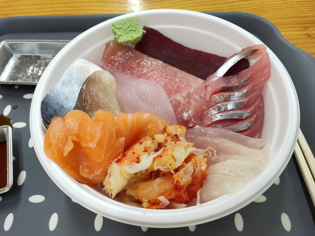 ご飯の上に自分で市場の中から好きな具を選んでのせて食べるスタイルの勝手丼が有名なのですか、いざ行ってみるとそれらしき所が見当たりません。うろうろしているうちに声をかけられるとどうやらそこが勝手丼の場所のようです。今では2店のみの実施だとか。