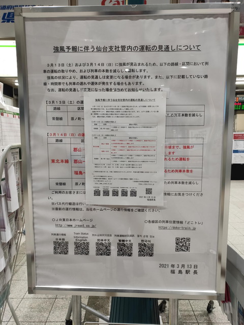 前日の夜に通過して三陸沖で急速に発達した低気圧の影響で、かなり強い風が吹いています。その影響を受けて、福島県内の在来線は一部運転本数を減らすとか時間帯において運転見合わせをするという案内が出ていました。