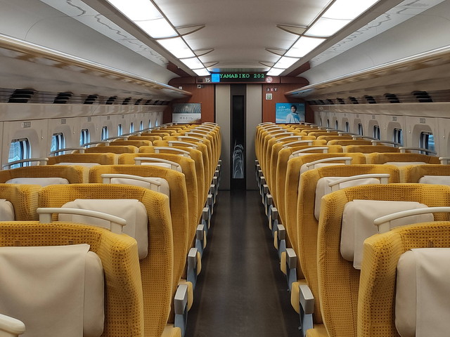 自由席が4両しかなく、ある程度混雑を覚悟はしていましたけども、少しだけ残っていた窓側座席に座ることが出来たので、乗車率が4割~5割といったところでしょう。