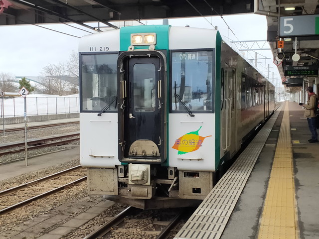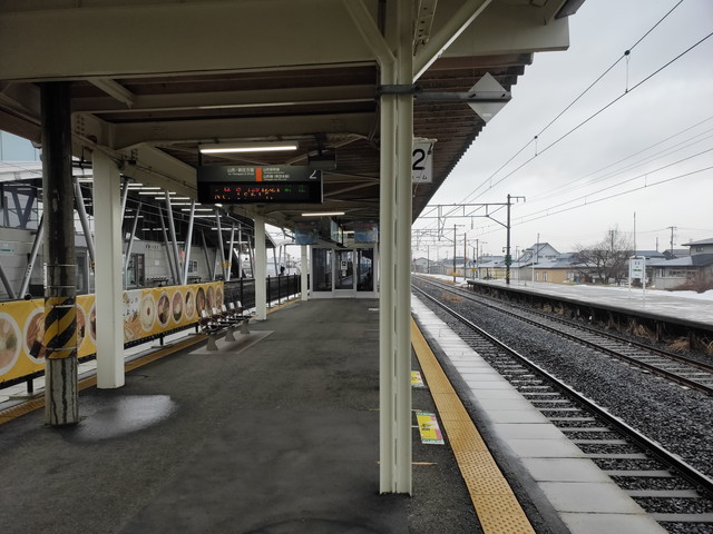 天童を過ぎたあたりから徐々に雪が深くなってきて、大石田あたりまでくるとすっかり雪景色といった感じですが、特に遅れもなく定刻通りに終点の新庄駅に到着します。