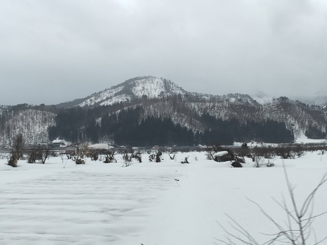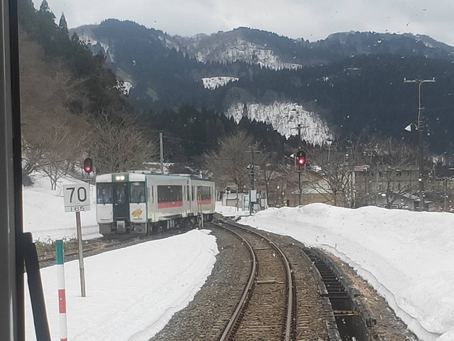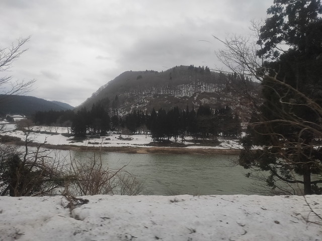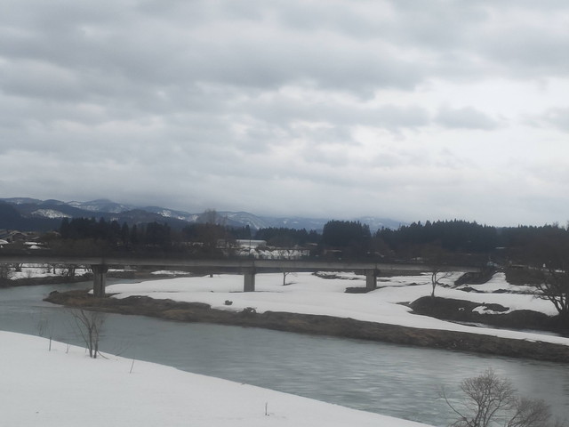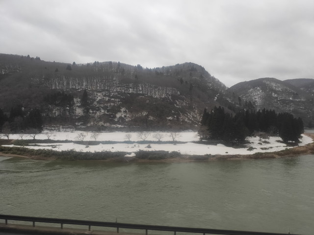 ちょうどこの辺りは最上川の川下りで有名な場所でもありますので、進行方向右側には緩やかに流れる最上川を眺めることができます。この時期は本数は少ないもののこたつ船も出ているので夏の時期とは一味違う眺めを楽しむことができるようになっています。