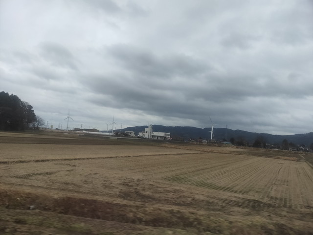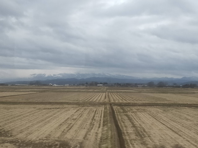 進行方向左側には月山を中心とした山々が、右側には鳥海山を中心とした山々がそれぞれそびえ立ちます。ただあいにくの天気でもあるため近場の山しか見る事は出来ませんでした。