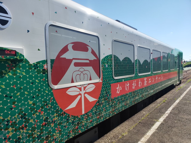 駅員さんは既にいるようでフリー切符とかもここで購入することができます。すでに列車は入線していて一両のディーゼルカー、キハ20形のラッピングをした車両が止まっています。