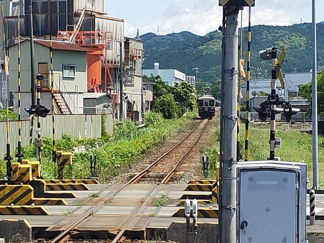 森町病院前で再び降りて遠くを眺めていると、直線の向こうに反対列車が見えましたので、あそこが遠州森駅のようですね。