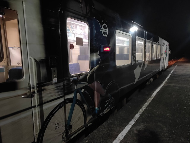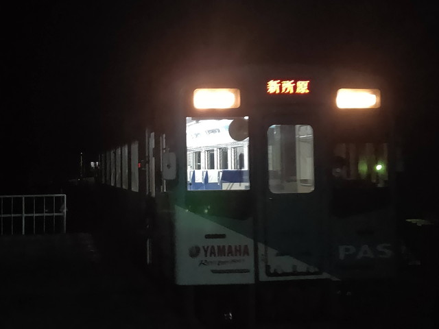 やってきたのは、ヤマハPASS号でした。電動アシスト付き自転車のヤマハPASSを全体にラッピングしています。駅自体がかなり暗いので観察するのは明日にまた同じ車両に乗る時にします。