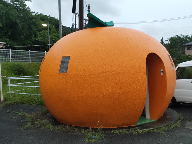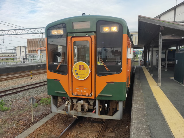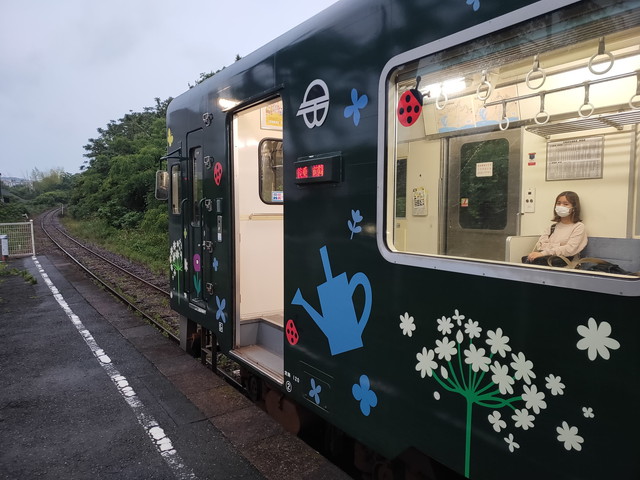 みかんの形をしたトイレを見ながら(沿線にはいろいろな形のものあり)やってきた1両の花リレー号に乗車します。仕事帰りの人も使うようでボックス席に1人ずつくらいの乗車率でした。