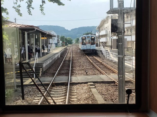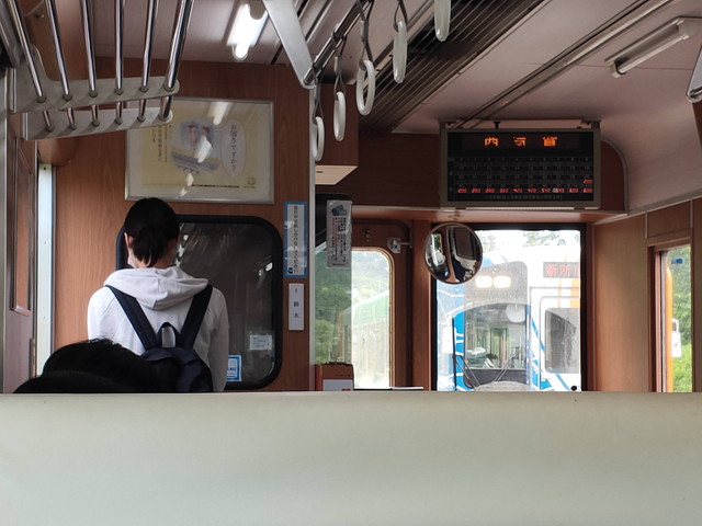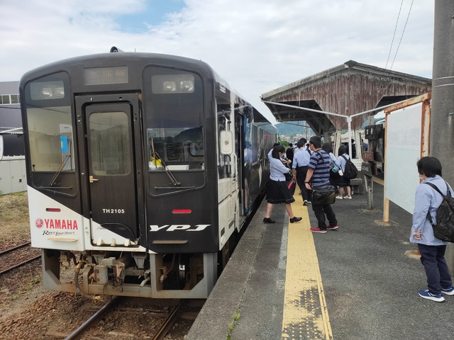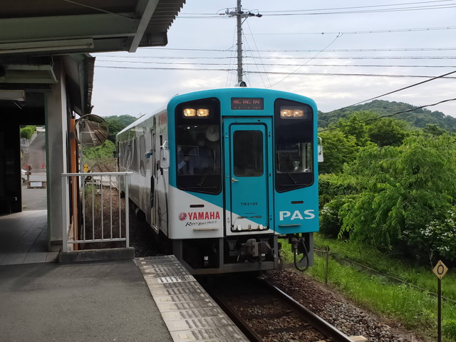 反対列車はヤマハ PAS 号で浜松湖北高校に通う生徒で立ち客が出るくらいの混雑でした。とはいえ車内はほとんどスマホを触っていて静かで、先ほどまでのおしゃべりで賑やかな感じとは違っていました。 こちらも金指駅で生徒が降りたので、その先はほぼガラガラとなり気賀駅まで向かいます。