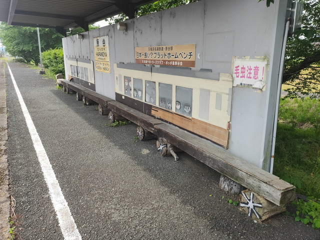 原谷駅はかつて2004年のテレビドラマ”WATER BOYS 2”のロケ地となった場所であり、その時の駅名標が今でも残っていますし、駅自体も国の有形文化財に指定されていて木製の改札口やホームに上がる階段、ホームに残る当時からの木製ベンチなどがあります。