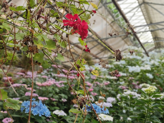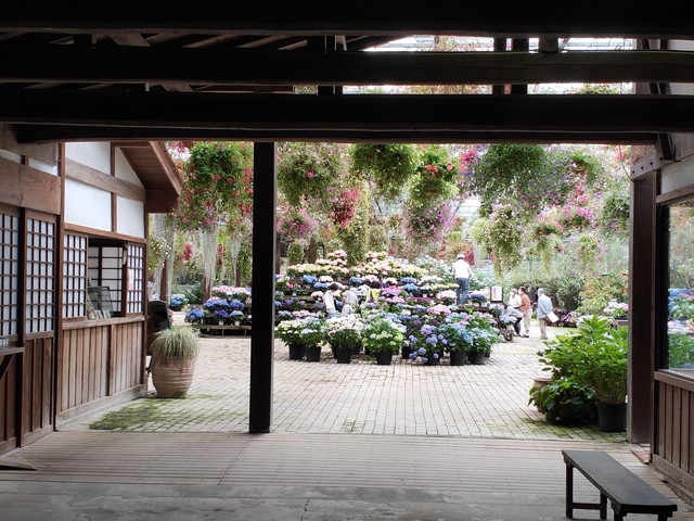 この建物自体が温室になっていて、見渡す限りアジサイに覆われています。ここで独自に品種開発されたものとかもあって展示即売もされていました。温室の中を見るだけでも30分はゆうにかかりそうです。この中に食事場所もありランチやカフェとして営業しているので、アジサイを眺めながらホッと一息つける時間を過ごす人も多くいます。