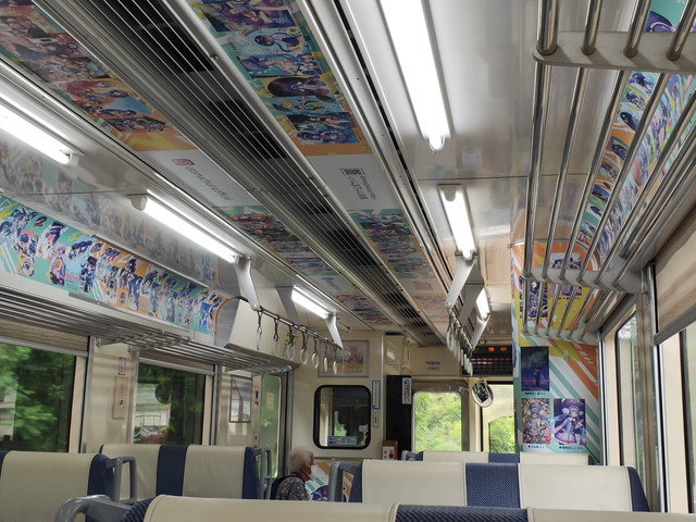 原田駅から乗車した天竜二俣行きは、ボーカロイドの音街ウナのラッピング列車です。社内のあらゆるところに一般公募で入選した似顔絵の作品が飾られています。