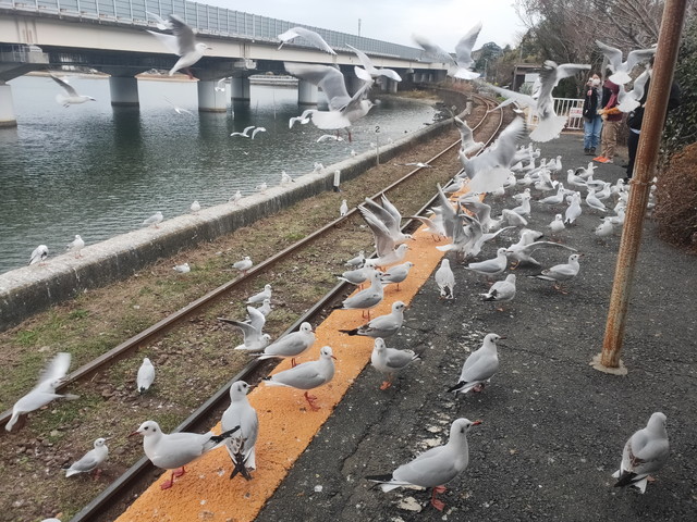 浜名湖佐久米駅では1月を中心にユリカモメがホームを我が物顔で飛んでいるのが冬の風物詩となっていて、ゆるキャン△においてもそのシーンが見られます。