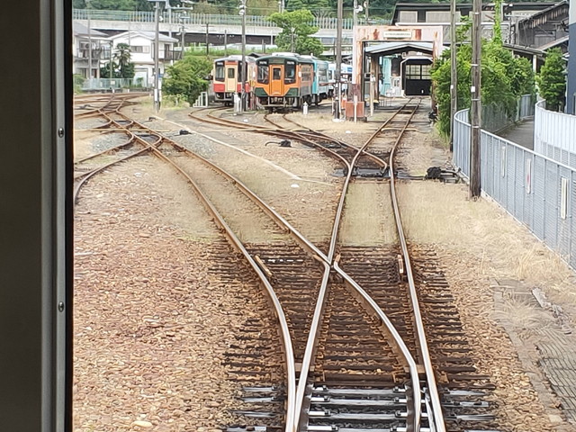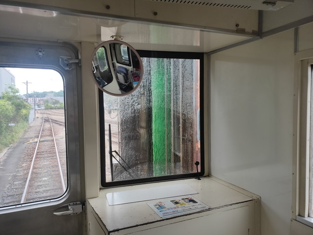 列車に乗り込むと、ポイントを通りながら掛川寄りの車止めのあるところまで行き、ここで再び向きを変え一番駅舎から離れたポイントまで移動します。もう一度向きを変えると洗車台を通過します。実際に水がかかって洗車ブラシが回るところを通過するのは滅多にない体験でしょう。