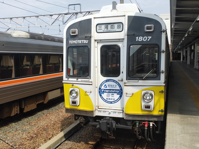 豊橋鉄道の電車は車体カラーが花の色を彩ってカラフルです。全部で10色あり、最初に乗ったのが菜の花の黄色、今度の列車は菊で少しオレンジがかった色あいです。