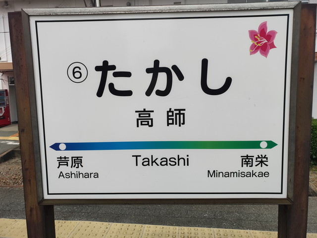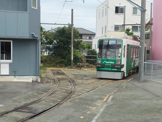 車両基地のある高師駅で下りて、濃い緑色のツバキを彩った車両で新豊橋へと戻ります。