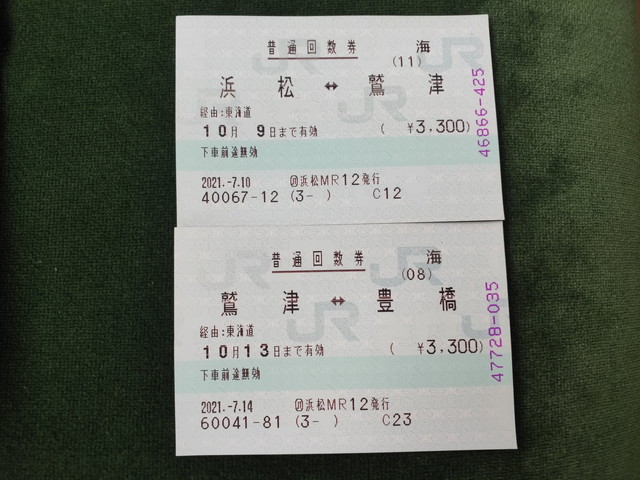 乗車券も金券ショップで60円引きの620円で購入しました。左の写真のように分割した乗車券を組み合わせるので、浜松と書かれた乗車券で入場して、出る時は2枚重ねて出れば自動改札もばっちりです。