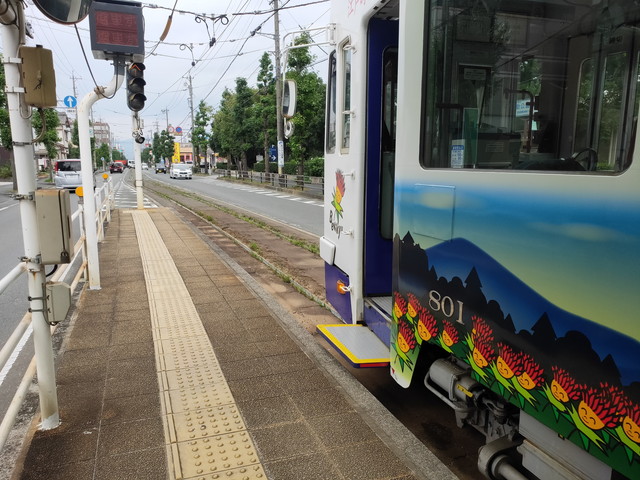 道路に直接降りる東田電停へ
