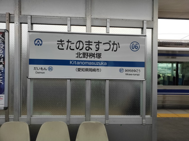 やってきたのは2両編成の高蔵寺行きですが、横に「北野桝塚のりかえ」と赤字で出ています。