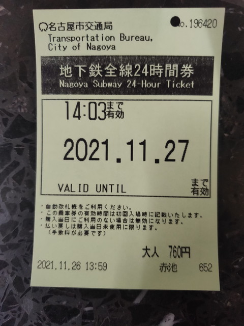 名古屋市営地下鉄は土日ですとドニチエコきっぷが620円で利用できるのですが、平日においては地下鉄24時間券のほうがおトクになったりもします。