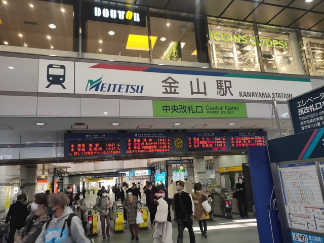 14:28に上前津で下車して名城線に乗り換えようとすると1本早い14:31発に乗れたので、これで金山に向かい14:35着。地下からの長いエスカレーターに乗りながら地上の名鉄・JR駅に出ます。