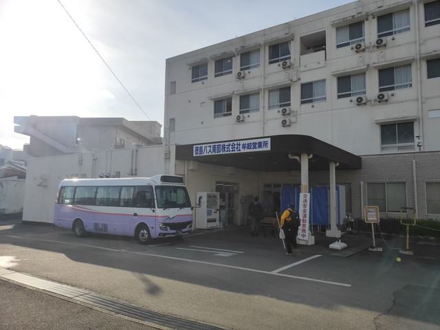 牟岐駅前にはバス停は無く、すぐ前にある国道沿いにも見当たらないので全く知識がないと焦りますが、国道を過ぎて真っすぐ行くと右手にこじんまりとした車庫と看板のついた建物が見えてきます。