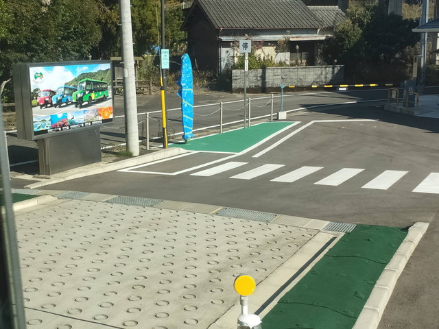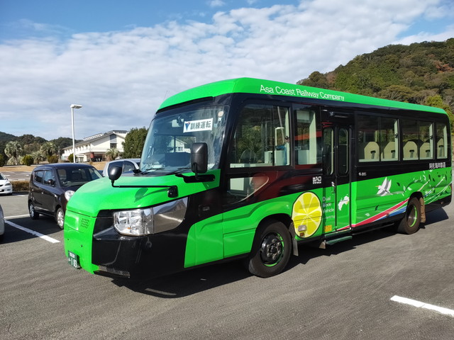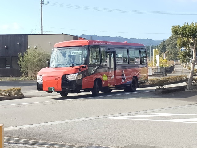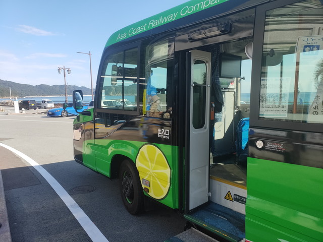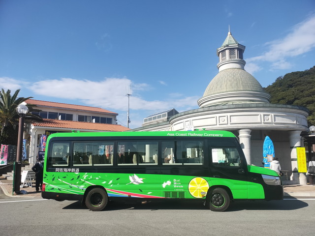 続いて緑色の車両が到着します。こちらに自分たちが搭乗し、11:09発の111便及び012便として阿波海南文化村~道の駅宍喰温泉~阿波海南文化村を往復したのち、ファンクラブの次の便となる115便及び016便となるようです。
