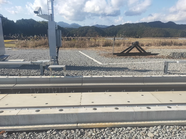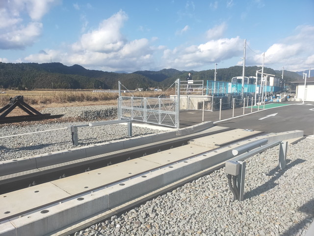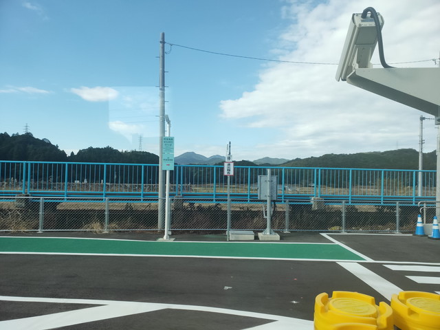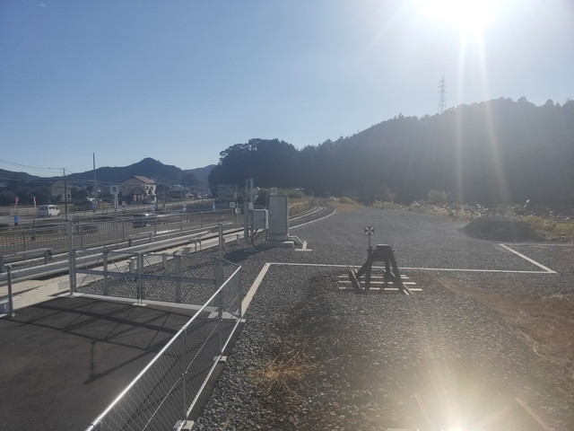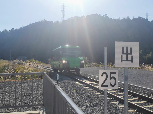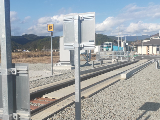 ここで再びモードチェンジを行い、車体が下がってタイヤが地面に着くとスロープを下りて甲浦駅の乗降所となります。その先に遮断機があり、これが開いて道路に出ます。