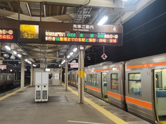 当初の予定は21:28発の特別快速豊橋行きに乗るので、もはやアウトなのですが、1本前の新快速が米原からの接続を待って15分以上遅れたせいで5分程度遅れているとのこと。