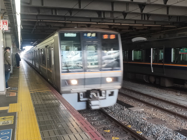 これは207系の7両編成でロングシートの車両になります。終点まで各駅停車となるので、大阪まで16駅も停まります。ちなみに快速は10駅、新快速は3駅ですからかなり駅が多いことが分かります。