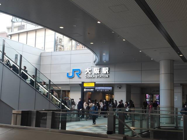 大きなビル群に囲まれるようにして大阪駅に到着して5分停車の間に乗客がドッと入れ替わります。