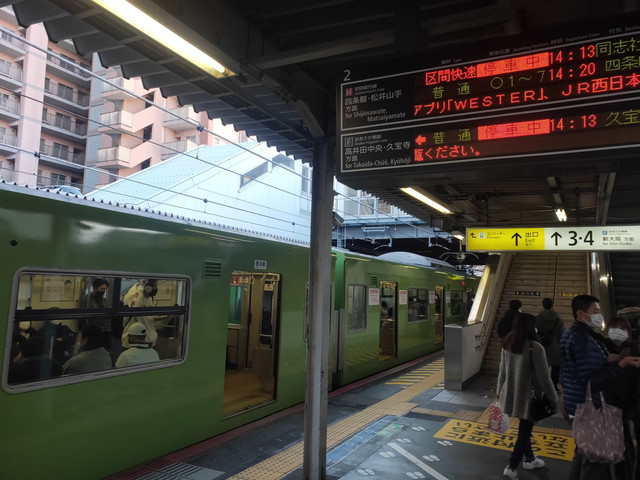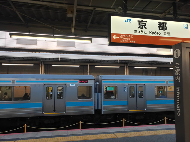時間的には京都まで普通列車でもいいのですが、普通列車は途中の稲荷に停まるので、伏見稲荷大社からの客がどっと乗るのを避けて快速に乗り替えました。16:12に京都駅に到着します。