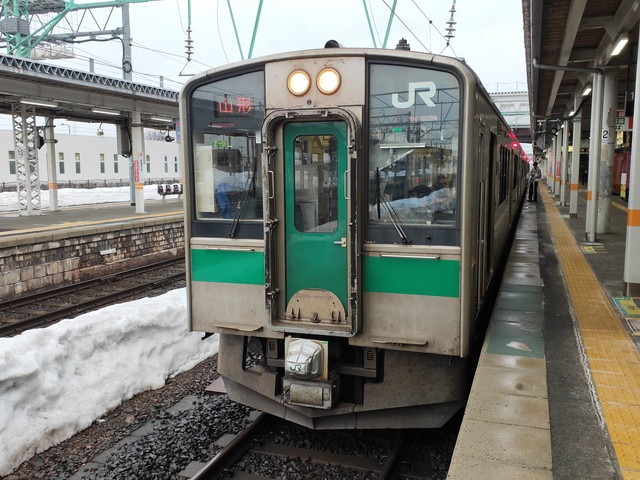 釜石線の快速はまゆり、北上線と西進しながら奥羽本線に入り真室川や新庄も抜けて一気に山形まで向かいます。