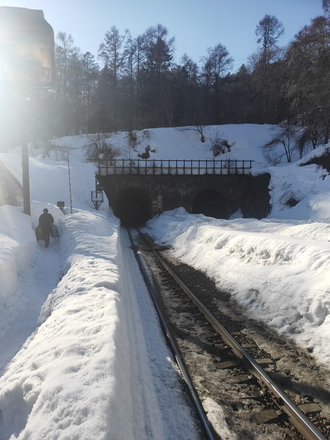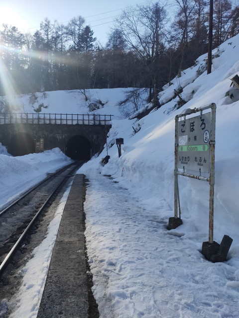 降りたのは私を含めて4人。それぞれ自由に観察しますが、反対のホームまで歩いていくのに踏切があり、列車が近づくと下りてくるのですが既に雪が深く積もっていて自分たちのつま先のところにバーがきました(笑)