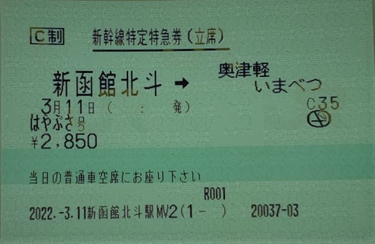指定券券売機の「新幹線指定券」を押し、新函館北斗から奥津軽いまべつの区間を選ぶと、立席というボタンがあるのでそれを押すと写真のような特急券が出ます。