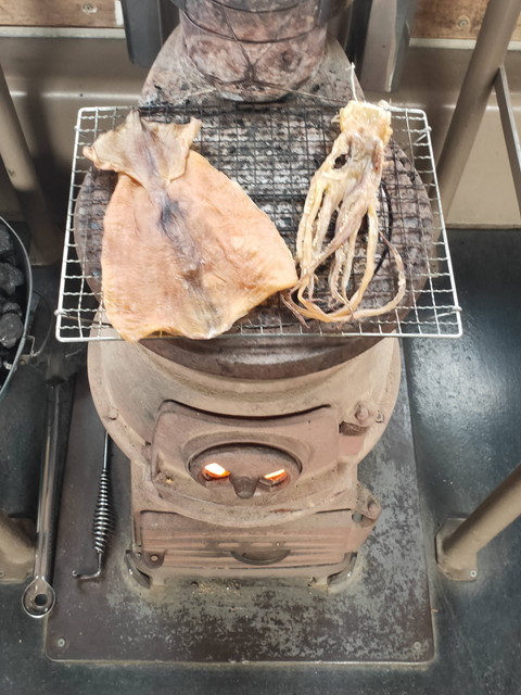 ダルマストーブには石炭をくべて火がついているので上でスルメが焼けます。もちろん車内販売で1枚500円で販売しており、ちゃんとカップ酒も売っているので一杯やりながらとなります。