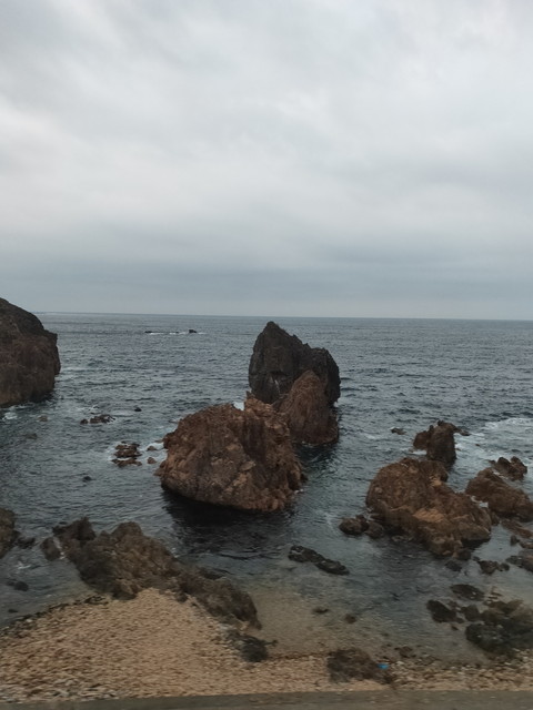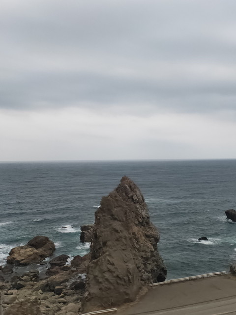 青森県から秋田県に入るところの大間越~岩館間も屈指の眺めの場所になり、季節のタイミングがあえば夕陽が美しく見えるところなのですが、あいにくの曇り空でした。