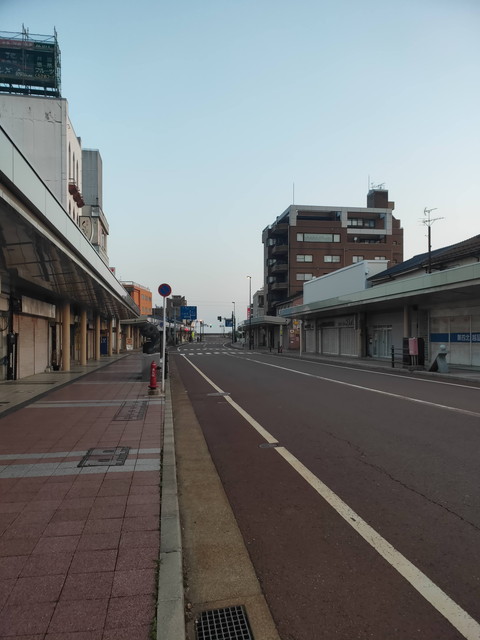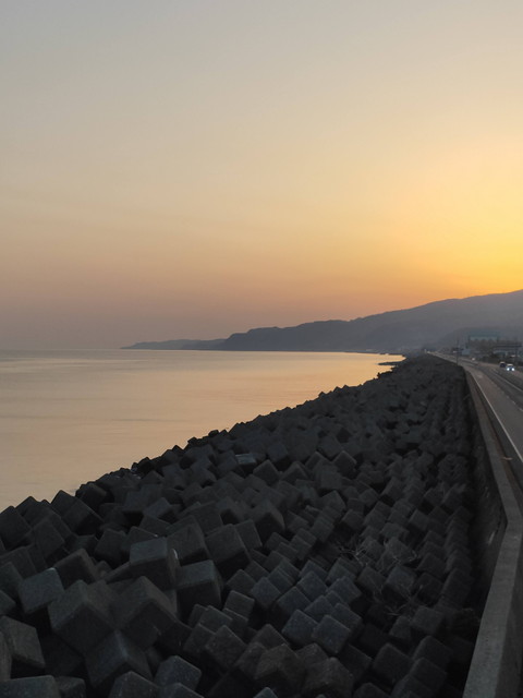 糸魚川駅近くのホテルえびやさんに前泊し、5時半過ぎにチェックアウト(前夜出発時間を聞かれた時にカギをフロントに置いていって下さいと言われた)し、徒歩5分ほどで海岸にある展望台に出られるとのことで日本海を眺め、駅の新幹線口にあるキハ52をガラス越しに見ながら改札へ。