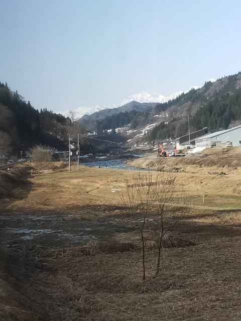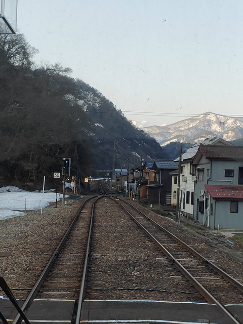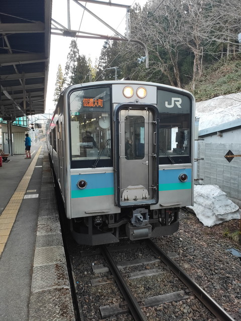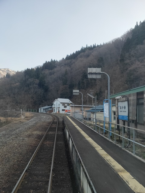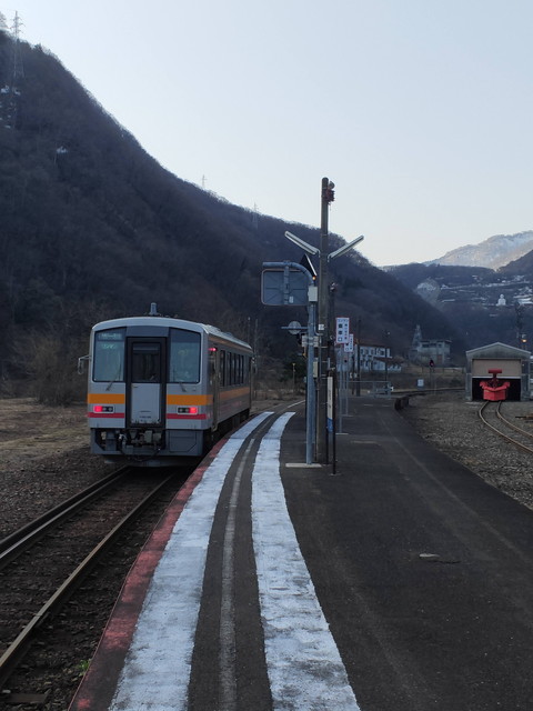 遥か向こうに雪をかぶった山が見えてきて頸城大野駅を過ぎ、山が前にも迫ってくる感じの行き違い駅である根知駅からは本格的に上り坂で、糸魚川駅の標高5mから南小谷駅の513mまでをうなりを上げながらゆっくりと進んでいきます。
