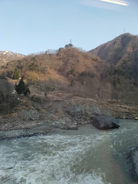 トンネルと雪崩覆いが連続し、時折渡る姫川も堤防で整備された感じではなく、雪解け水が泥を含んだ茶色い流れとなって勢いよく流れています。