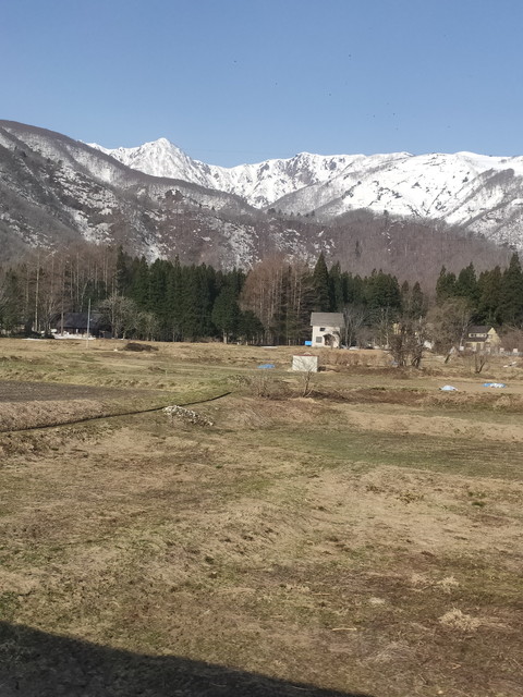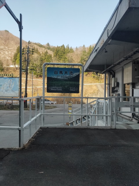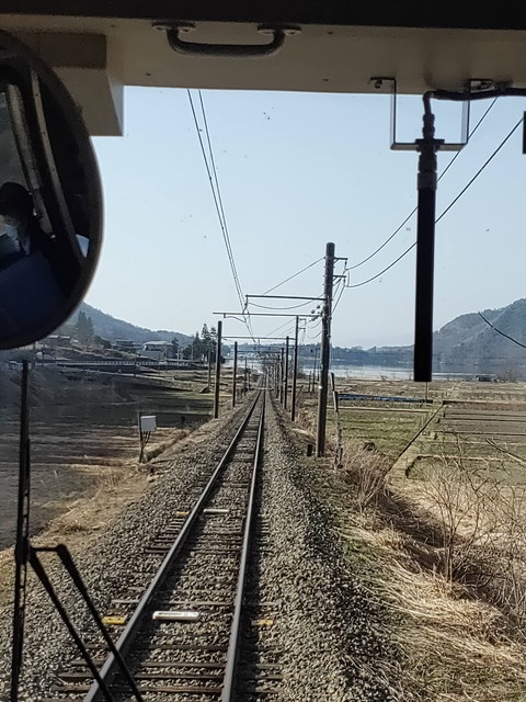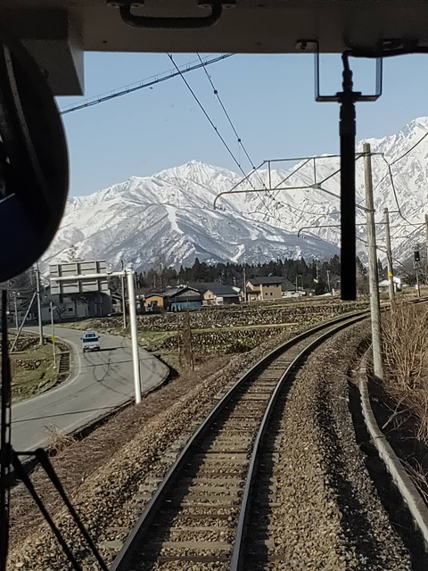 しばらくは速度制限区間なのか、40km/hくらいでゆっくりと進んでいき、姫川を一度渡って千国駅に入ります。もう一度姫川を渡ると白馬大池駅で、ダム湖となった姫川を渡ってカーブをするあたりで前面に突然でかでかとアルプスの山並みが現れるので、ここはかぶりついてでも見たいところです。