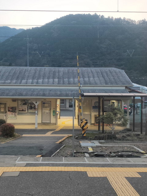 天龍村の中心地である平岡駅で8分停車。併設する龍泉閣のお土産コーナーももう閉まっており、駅はひっそりとしています。