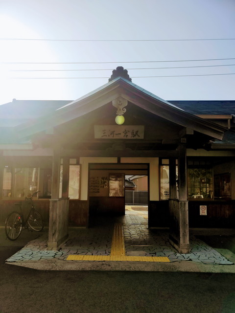 三河一宮駅は砥鹿神社前の交差点を右折していったところにある、見た目も立派な駅舎で木の板に墨塗りで書かれた駅名が風格を出しています。